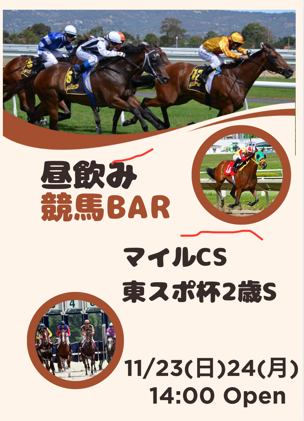 11/23(日)24(月祝)は14時Openでマイルチャンピオンシップ他中央競馬を飲みながらLIVE観戦!